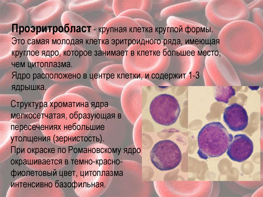 Проэритробласт - крупная клетка круглой формы.Это самая молодая клетка эритроидного ряда, имеющая