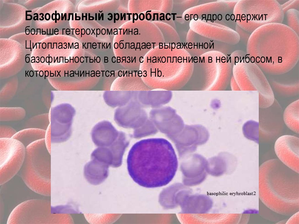 Базофильный эритробласт– его ядро содержитбольше гетерохроматина.