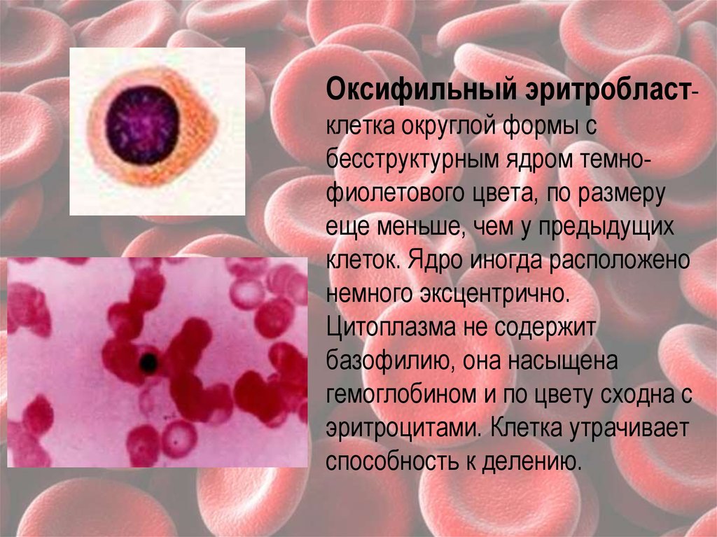 Оксифильный эритробластклетка округлой формы сбесструктурным ядром темнофиолетового цвета, по размеру