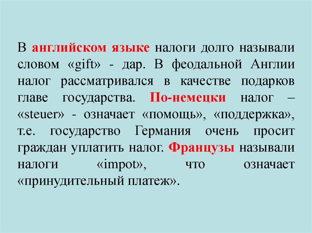 В английском языке налоги долго называлисловом «gift» - дар. В феодальной Англии
