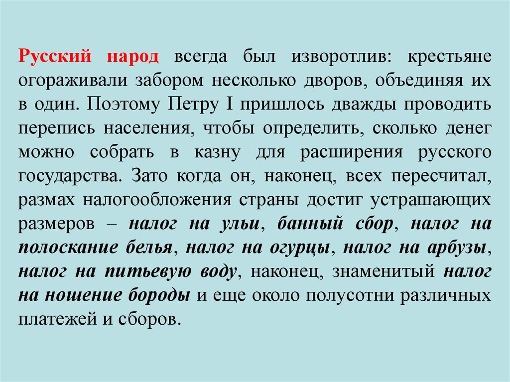 налог на питьевую воду, наконец, знаменитый налог