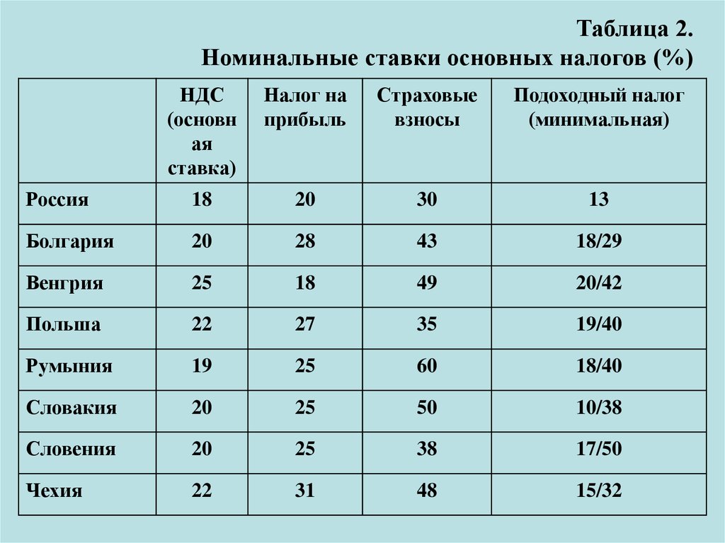 Таблица 2.Номинальные ставки основных налогов (%)