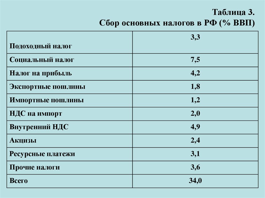 Таблица 3.Сбор основных налогов в РФ (% ВВП)
