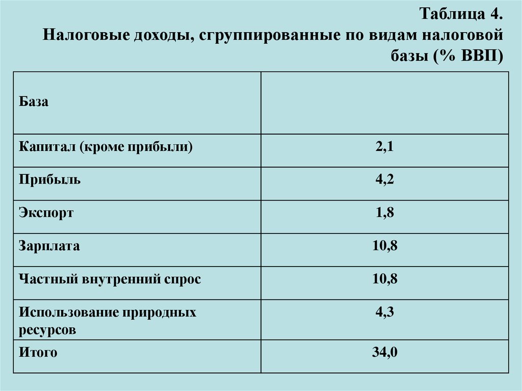 Таблица 4.Налоговые доходы, сгруппированные по видам налоговой