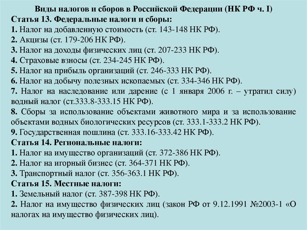 Виды налогов и сборов в Российской Федерации (НК РФ ч. I)Статья 13. Федеральные налоги и сборы: