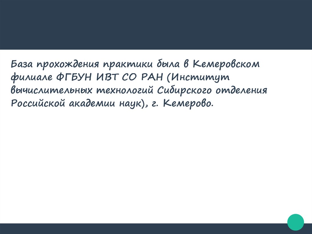 База прохождения практики была в Кемеровскомфилиале ФГБУН ИВТ СО РАН (Институт