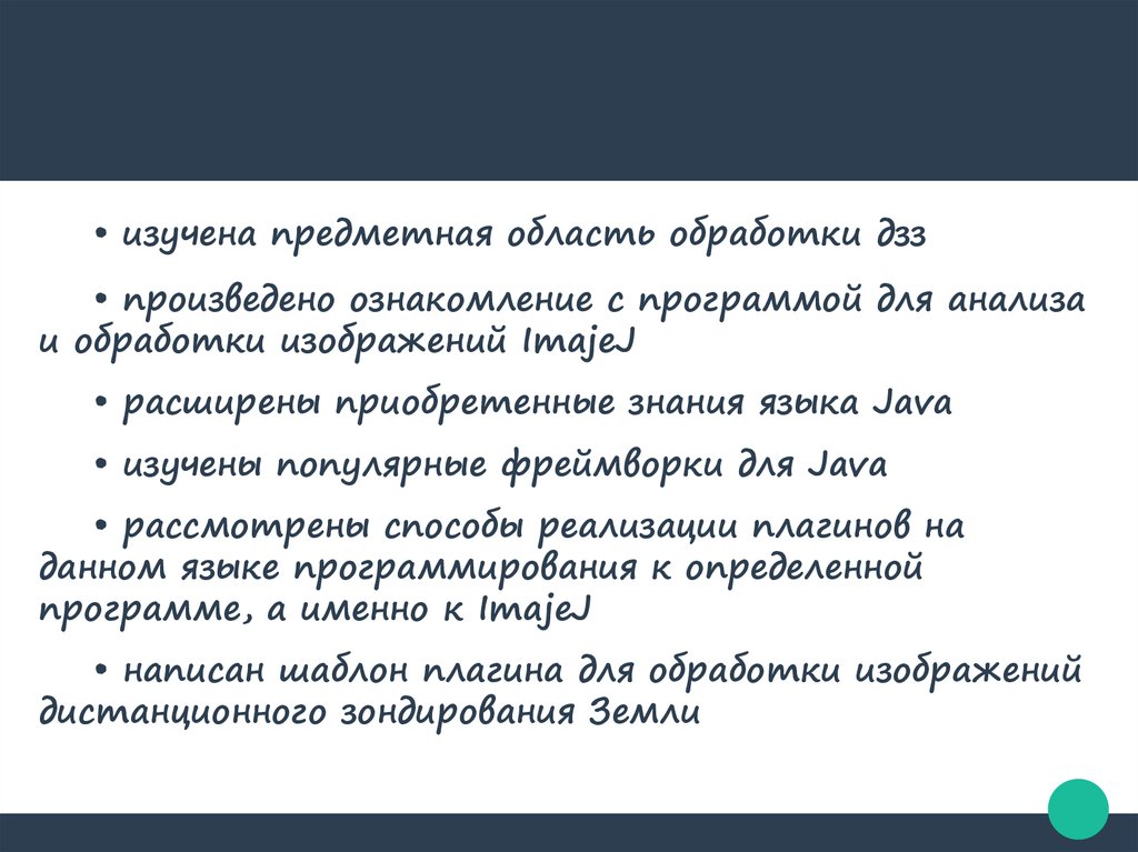 • изучена предметная область обработки дзз• произведено ознакомление с программой для анализа