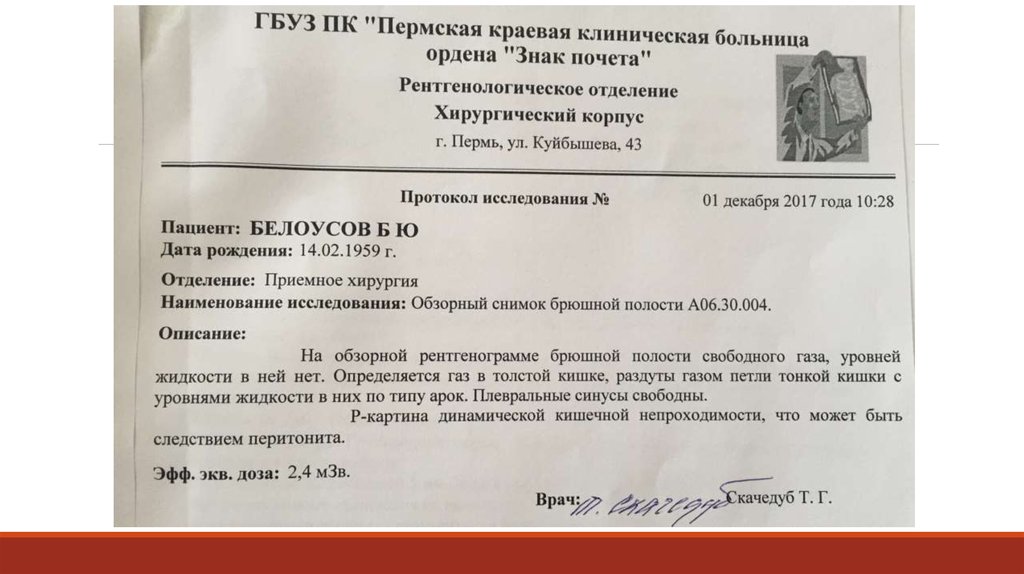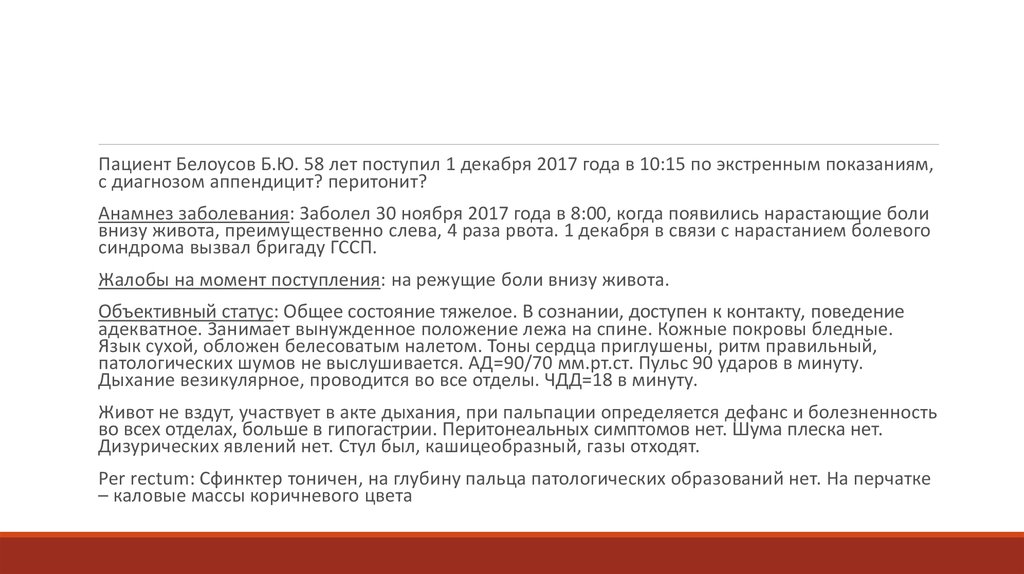 Пациент Белоусов Б.Ю. 58 лет поступил 1 декабря 2017 года в 10:15 по экстренным показаниям,с диагнозом аппендицит? перитонит?