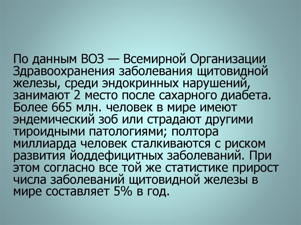 По данным ВОЗ — Всемирной ОрганизацииЗдравоохранения заболевания щитовидной