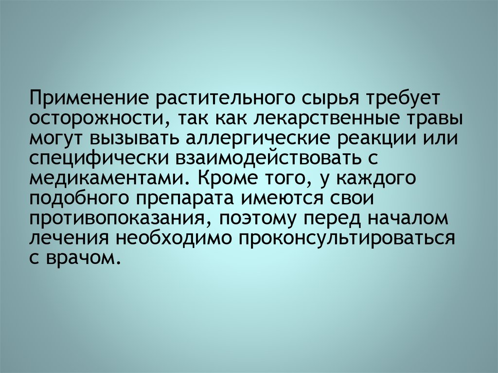 Применение растительного сырья требуетосторожности, так как лекарственные травы
