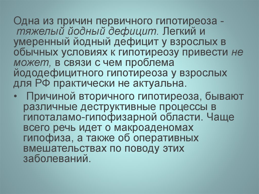 Одна из причин первичного гипотиреоза тяжелый йодный дефицит. Легкий иумеренный йодный дефицит у взрослых в