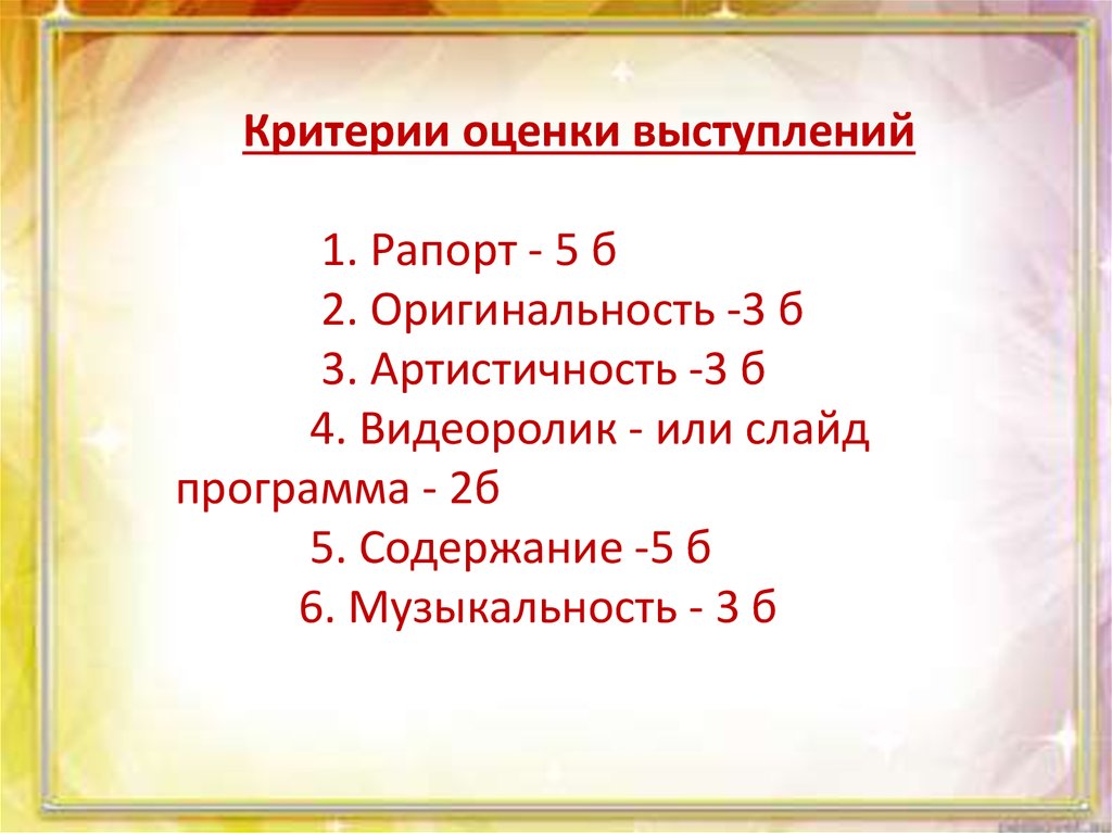 Критерии оценки выступлений1. Рапорт - 5 б