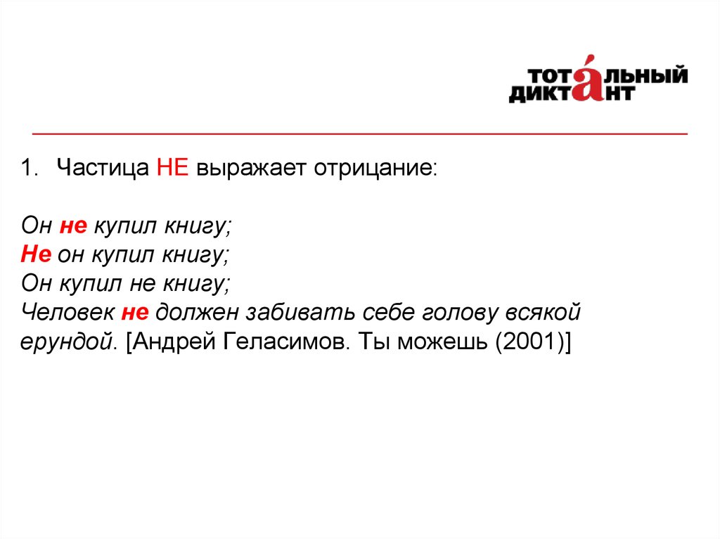 1. Частица НЕ выражает отрицание:Он не купил книгу;