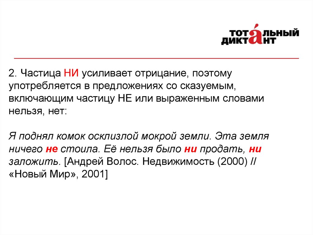2. Частица НИ усиливает отрицание, поэтомуупотребляется в предложениях со сказуемым,
