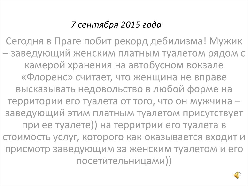 Сегодня в Праге побит рекорд дебилизма! Мужик– заведующий женским платным туалетом рядом с