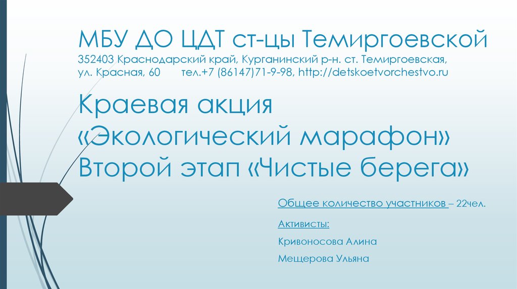 1. МБУ ДО ЦДТ ст-цы Темиргоевской 352403 Краснодарский край, Курганинский р-н. ст. Темиргоевская, ул. Красная, 60 тел.+7