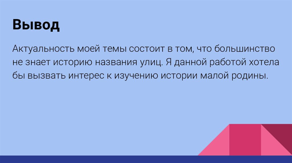 ВыводАктуальность моей темы состоит в том, что большинство