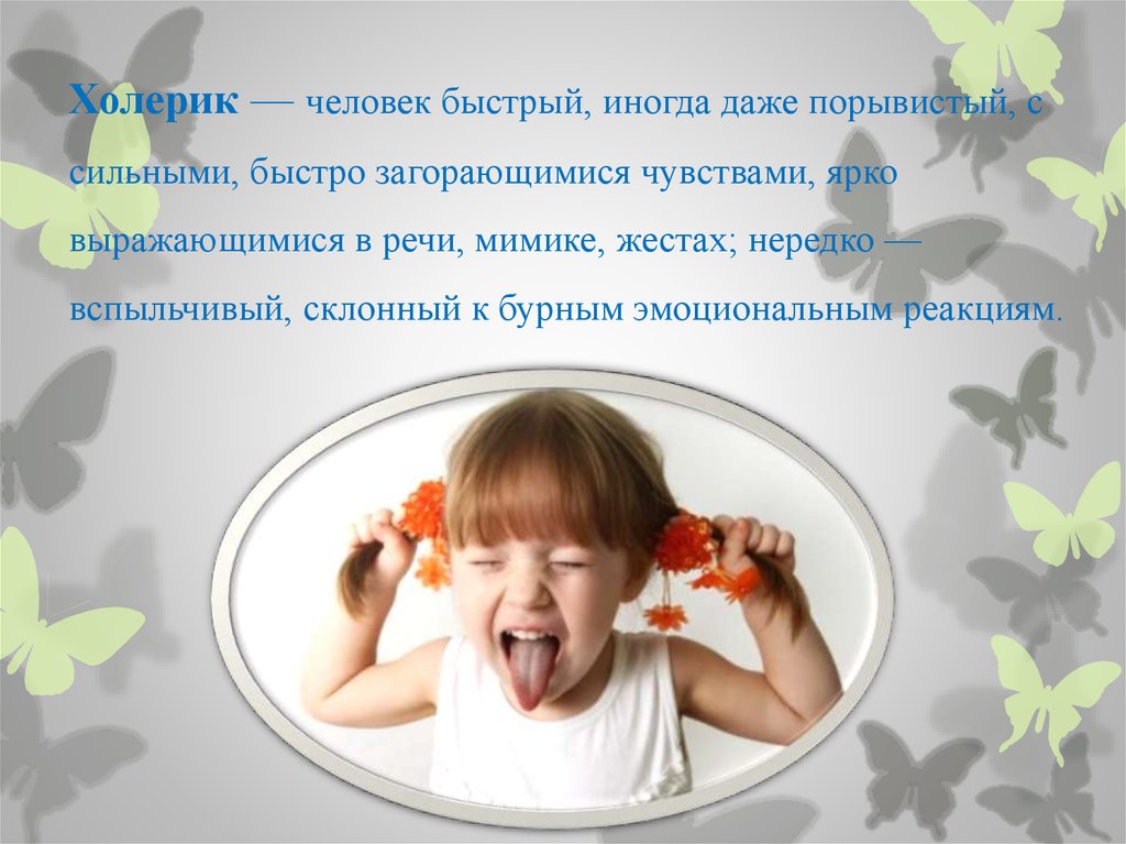 Холерик — человек быстрый, иногда даже порывистый, ссильными, быстро загорающимися чувствами, ярко