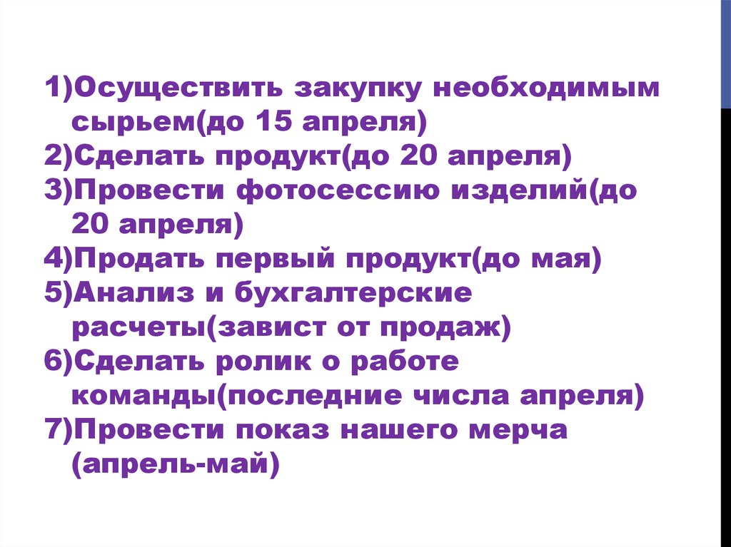 1)Осуществить закупку необходимымсырьем(до 15 апреля)
