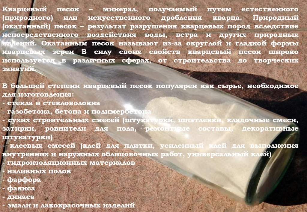 В большей степени кварцевый песок популярен как сырье, необходимое