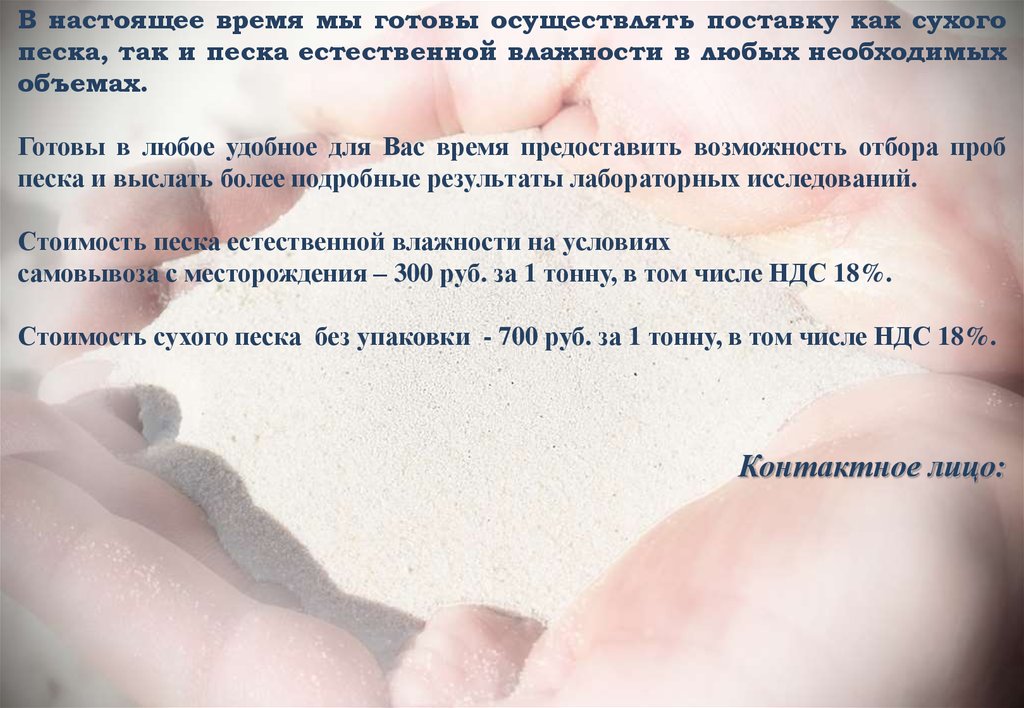 В настоящее время мы готовы осуществлять поставку как сухогопеска, так и песка естественной влажности в любых необходимых