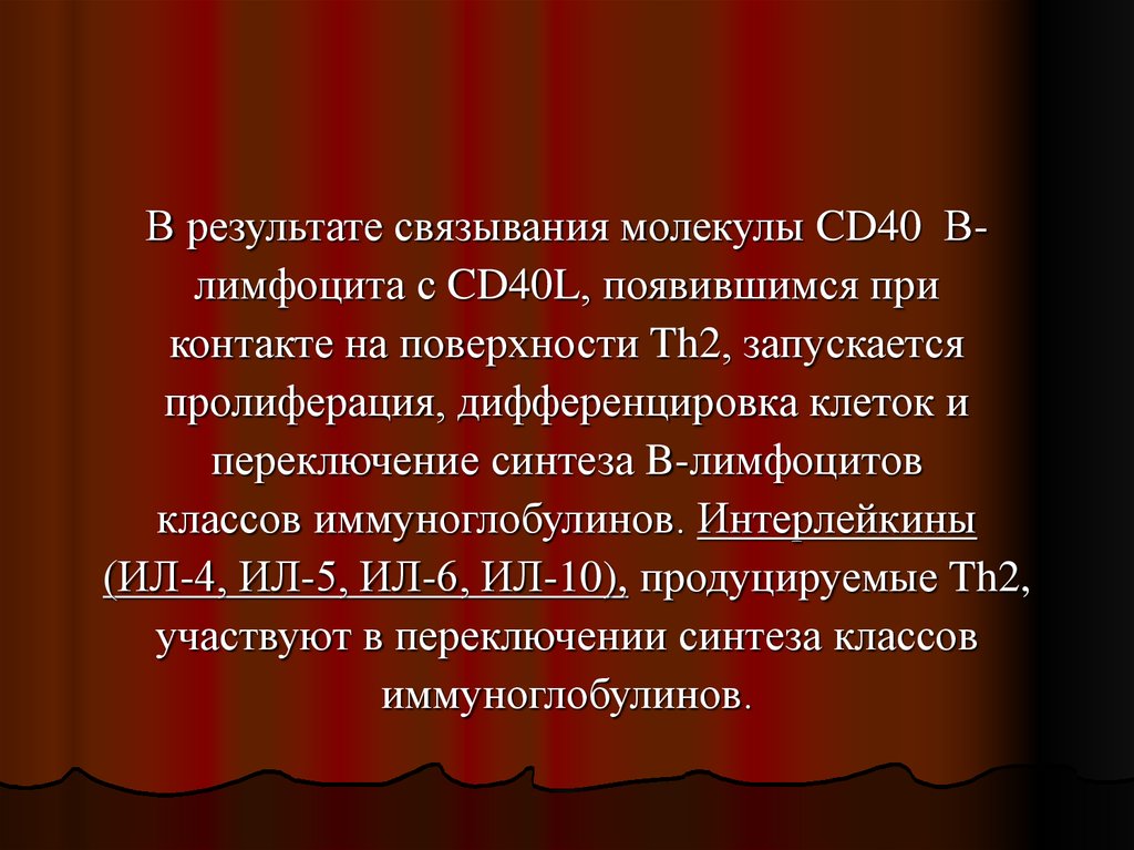 В результате связывания молекулы CD40 Влимфоцита с CD40L, появившимся приконтакте на поверхности Th2, запускается