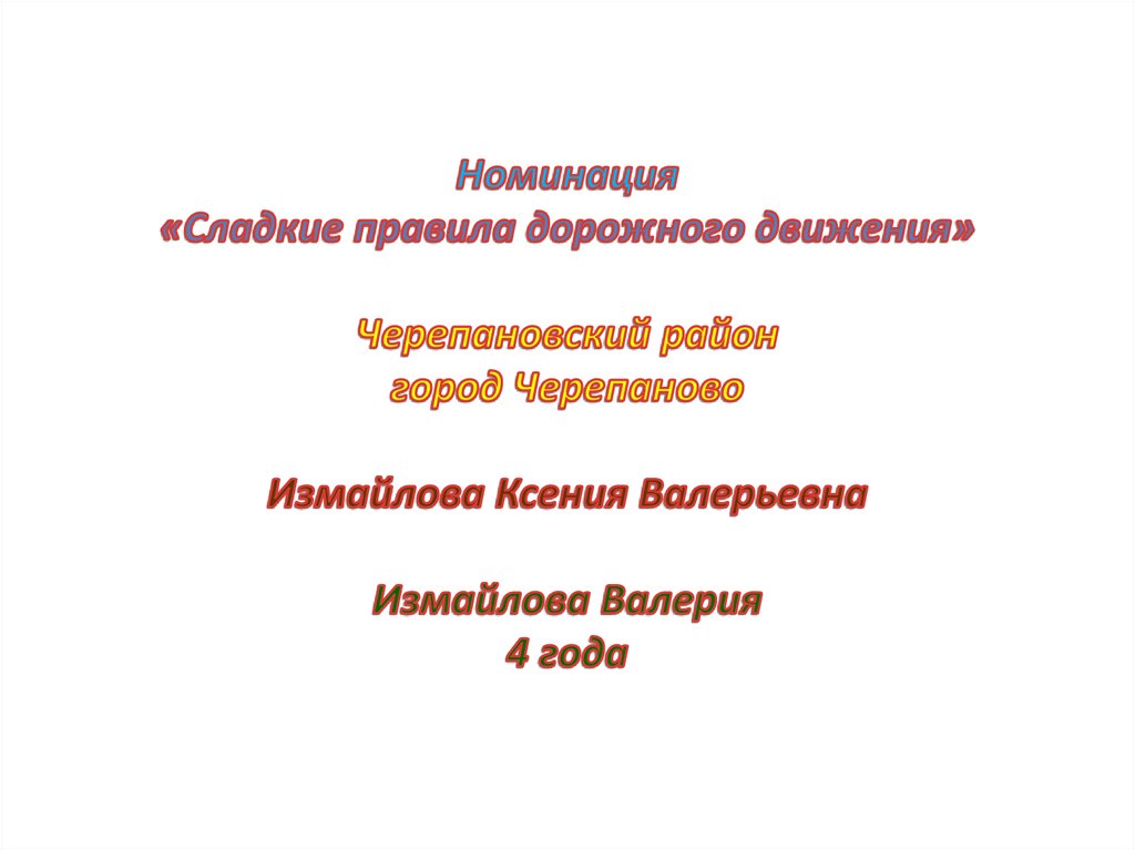 Номинация «Сладкие правила дорожного движения» Черепановский район город Черепаново Измайлова Ксения Валерьевна Измайлова