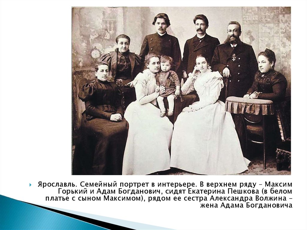 Ярославль. Семейный портрет в интерьере. В верхнем ряду – МаксимГорький и Адам Богданович, сидят Екатерина Пешкова (в белом