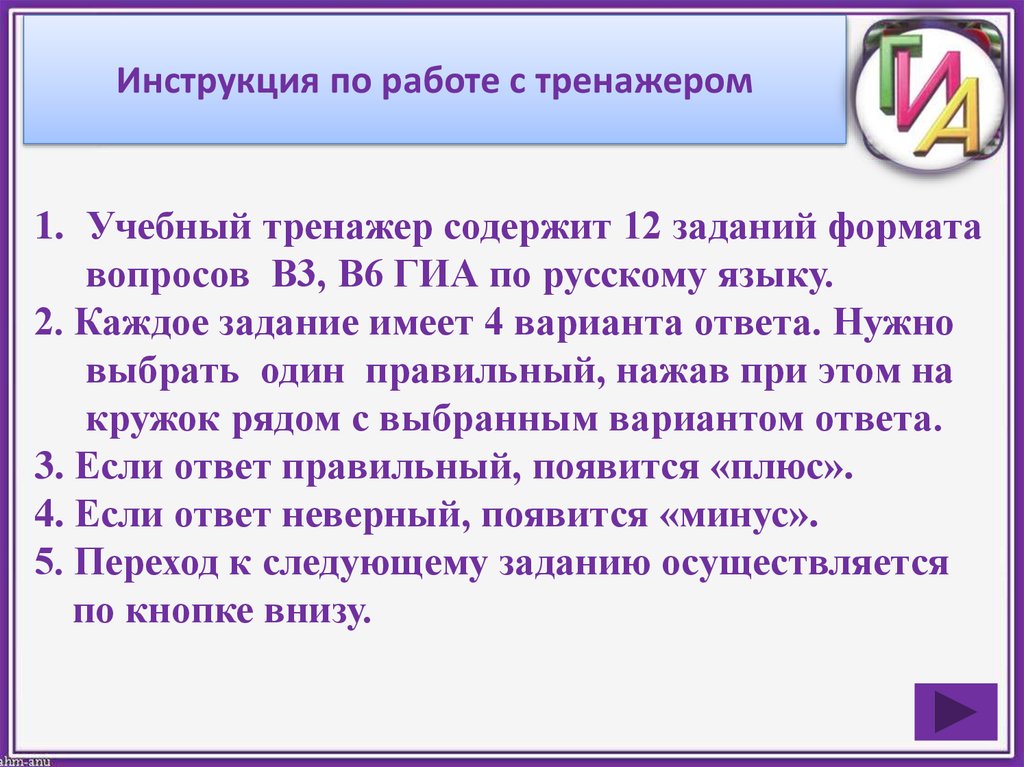 Инструкция по работе с тренажером1. Учебный тренажер содержит 12 заданий формата