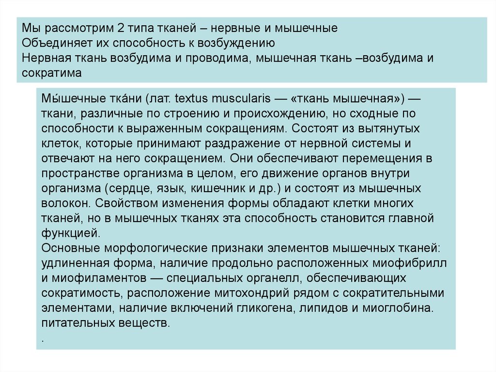 Мы рассмотрим 2 типа тканей – нервные и мышечныеОбъединяет их способность к возбуждению
