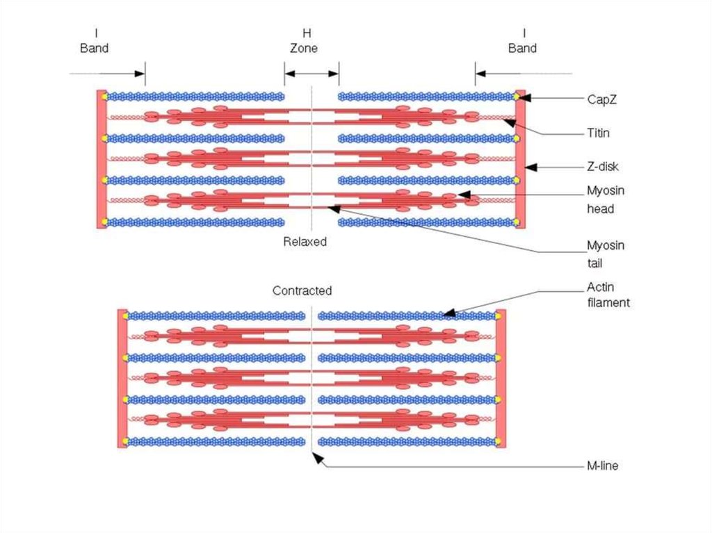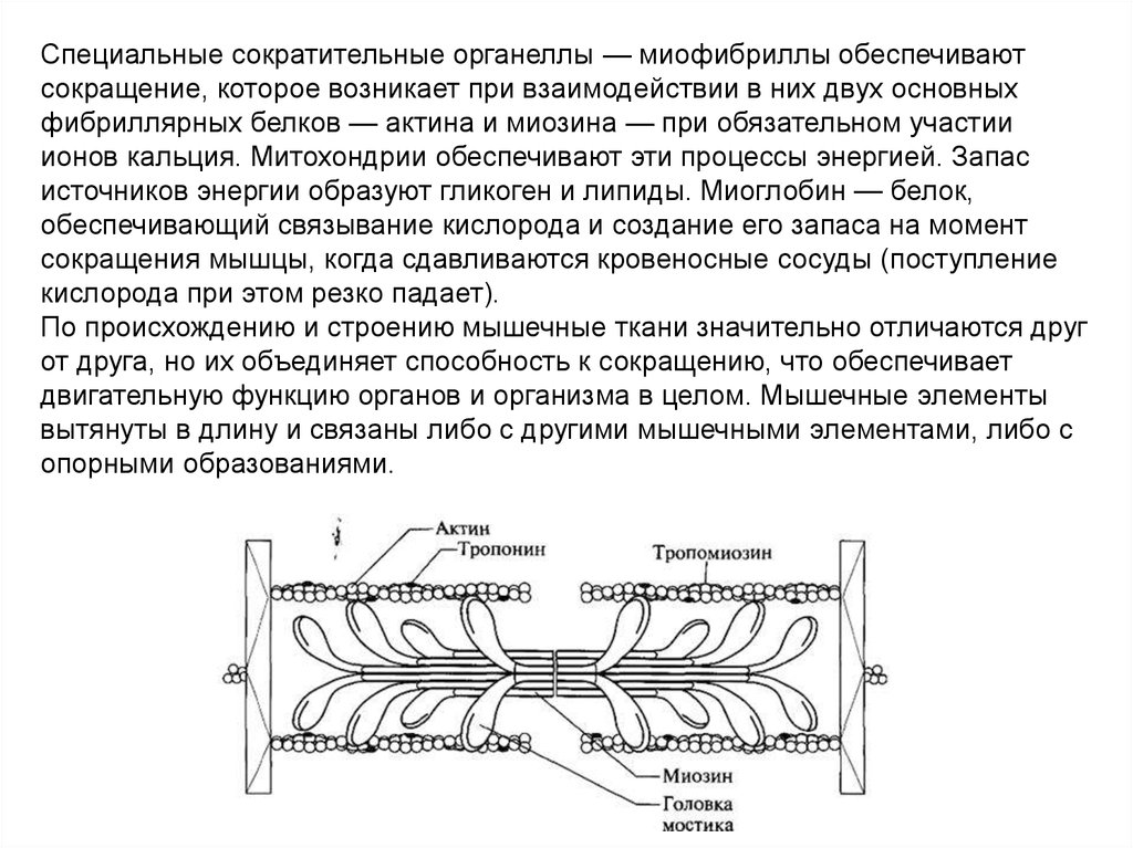 Специальные сократительные органеллы — миофибриллы обеспечиваютсокращение, которое возникает при взаимодействии в них двух основных