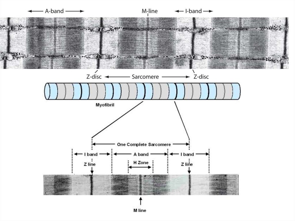 Каждая миофибрилла состоит из дисков имеющих разный химический