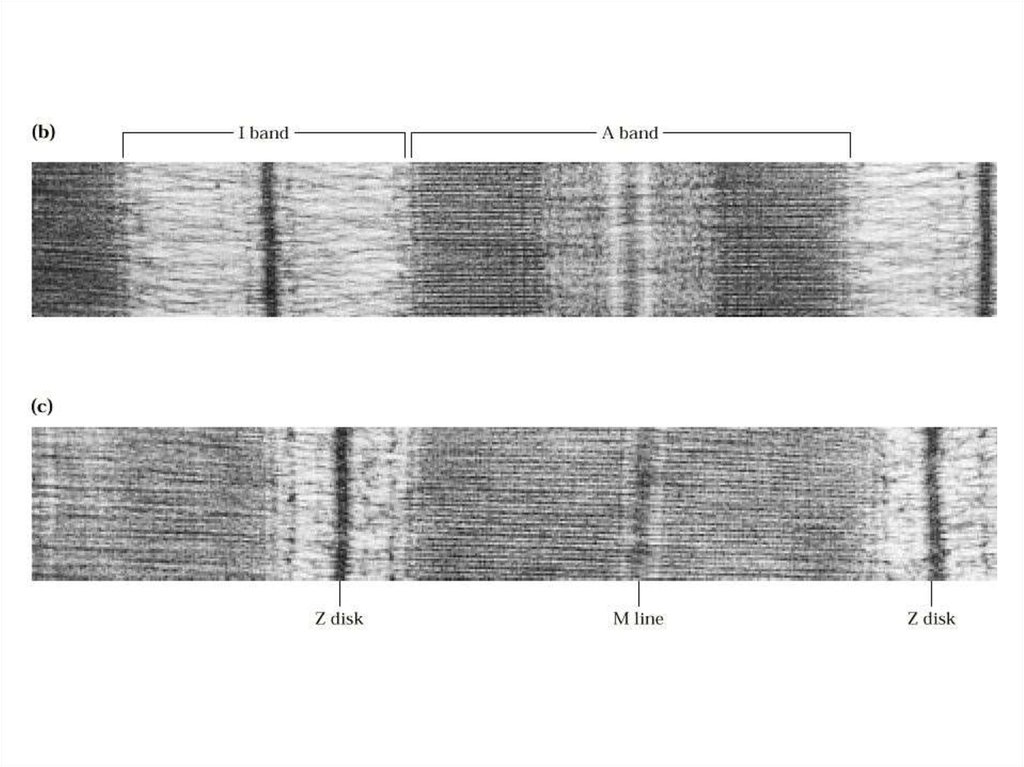 Однородные диски всех миофибрилл совпадают, и поэтому мышечное