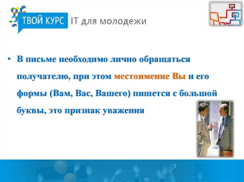• В письме необходимо лично обращатьсяполучателю, при этом местоимение Вы и его