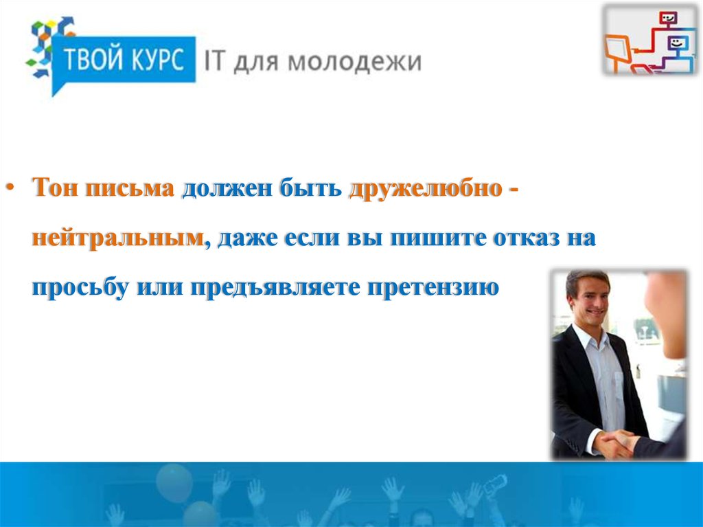 • Тон письма должен быть дружелюбно нейтральным, даже если вы пишите отказ напросьбу или предъявляете претензию