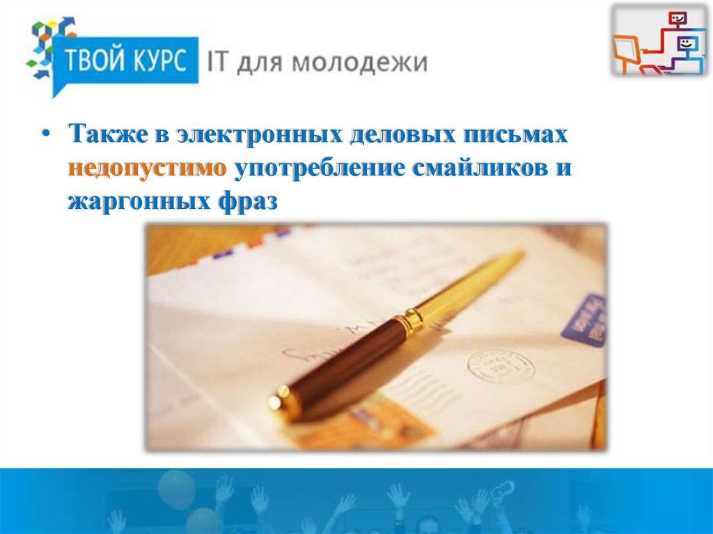 • Также в электронных деловых письмахнедопустимо употребление смайликов и