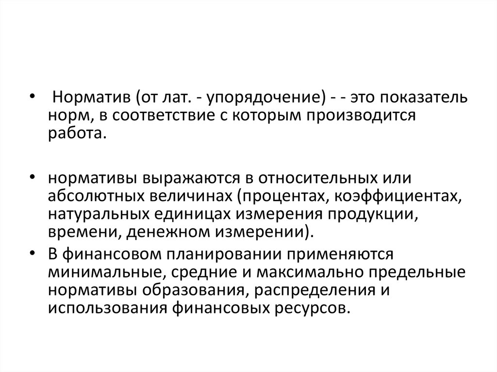 • Норматив (от лат. - упорядочение) - - это показательнорм, в соответствие с которым производится