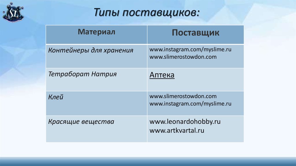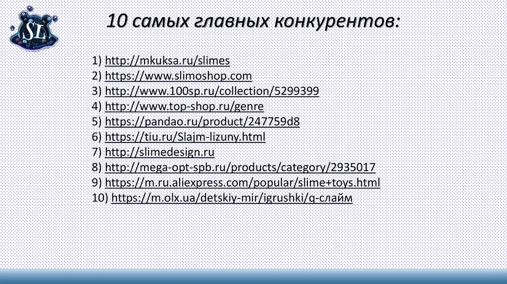 10 самых главных конкурентов:1) http://mkuksa.ru/slimes