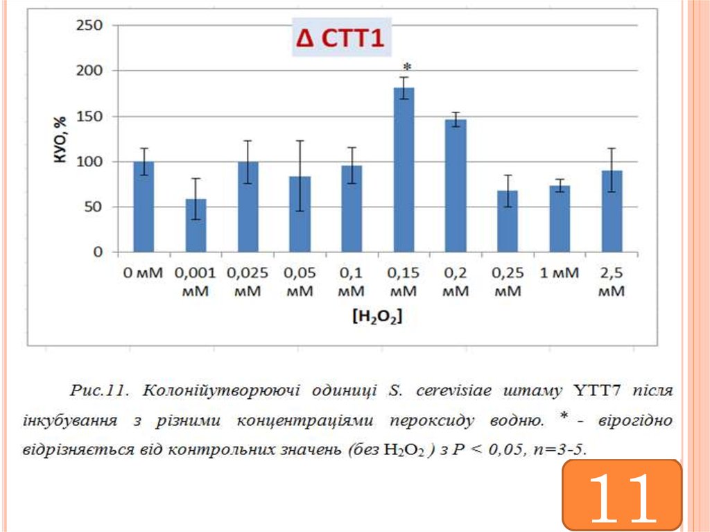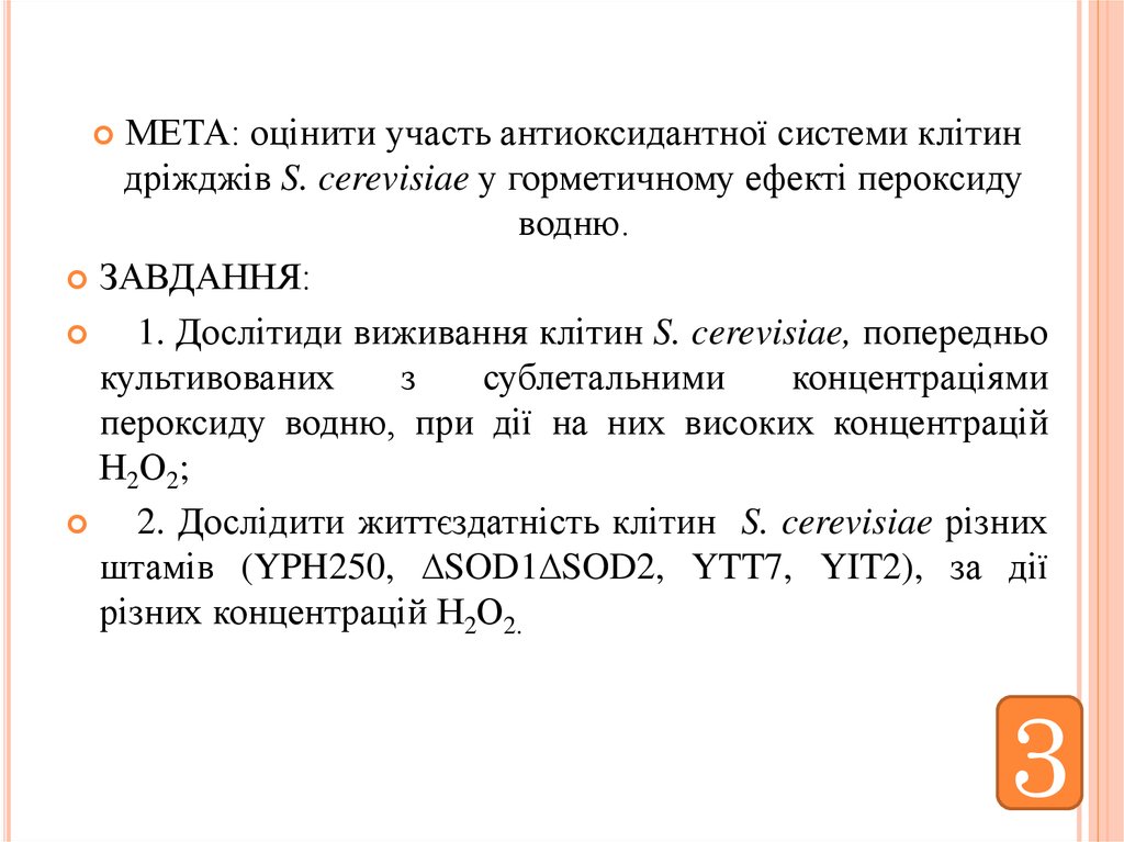 МЕТА: оцінити участь антиоксидантної системи клітиндріжджів S. cerevisiae у горметичному ефекті пероксиду
