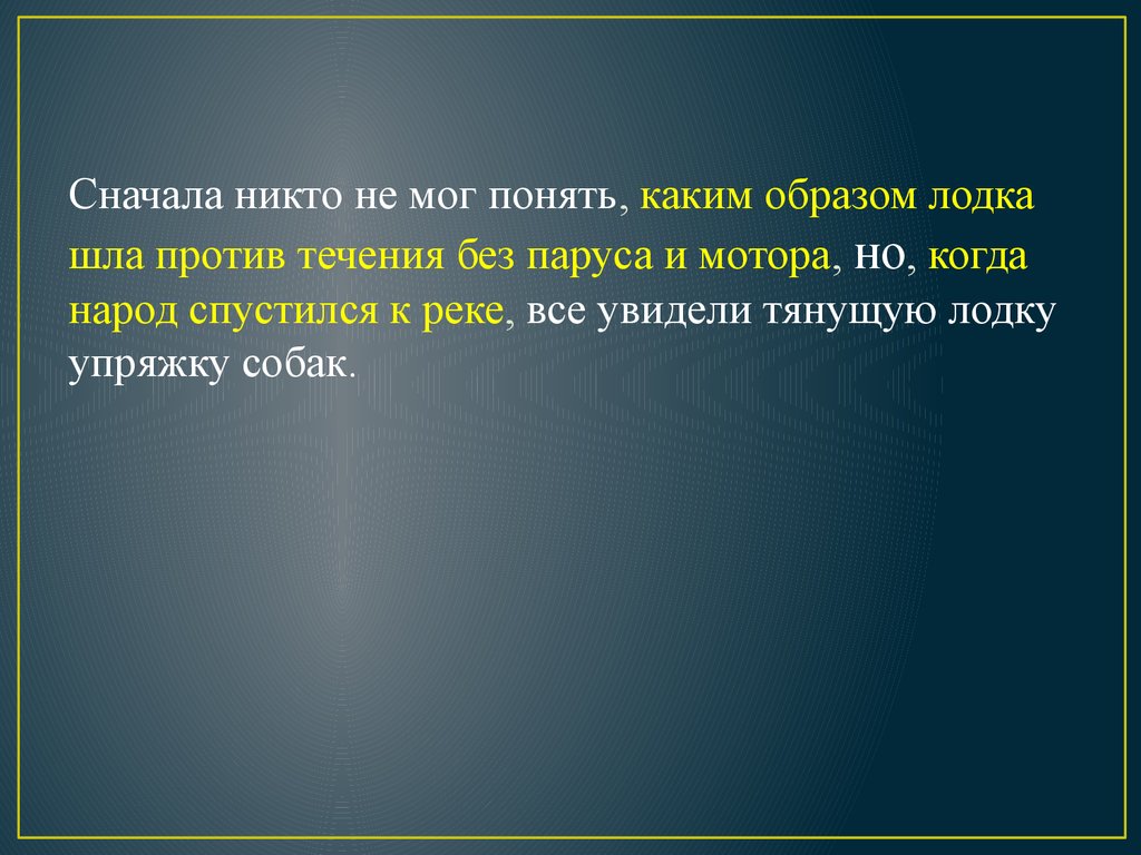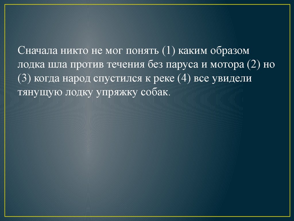 Сначала никто не мог понять (1) каким образомлодка шла против течения без паруса и мотора (2) но