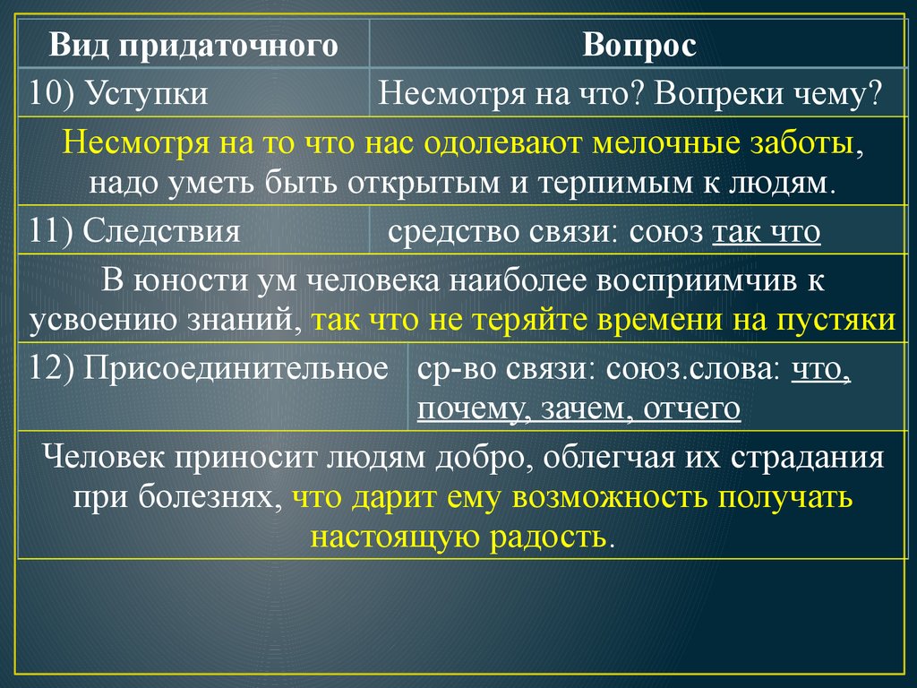 12) Присоединительное ср-во связи: союз.слова: что,
