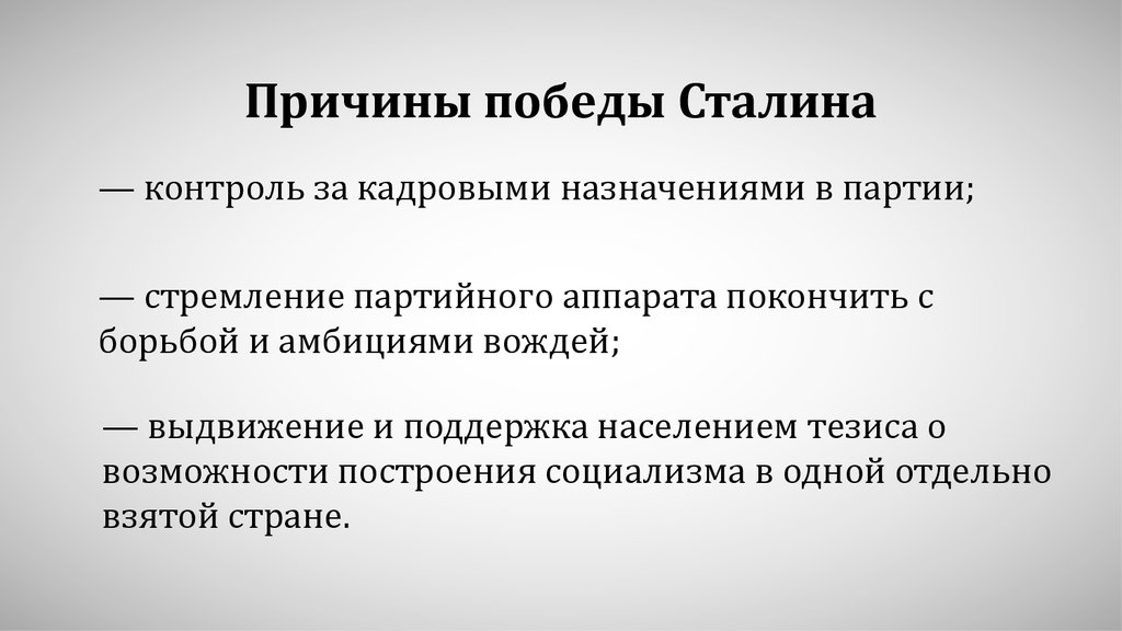 Причины победы Сталина— контроль за кадровымй назначенйямй в партйй;
