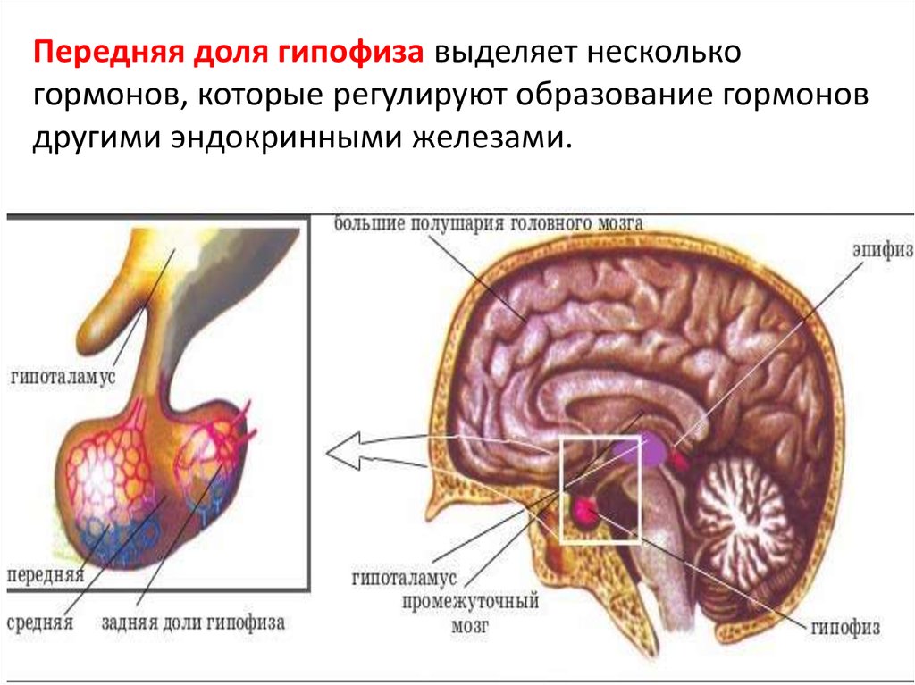 Передняя доля гипофиза выделяет несколькогормонов, которые регулируют образование гормонов