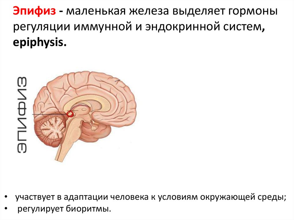 Эпифиз - маленькая железа выделяет гормонырегуляции иммунной и эндокринной систем,