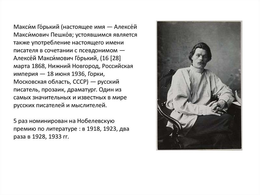 Макси́ м Го́ рький (настоящее имя — Алексе́йМакси́ мович Пешко́ в; устоявшимся является