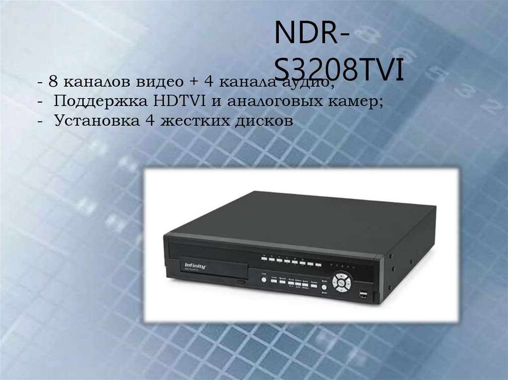 NDR- 8 каналов видео + 4 каналаS3208TVIаудио;