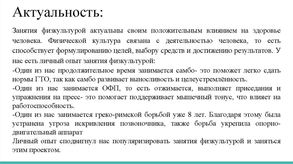 Актуальность:Занятия физкультурой актуальны своим положительным влиянием на здоровье