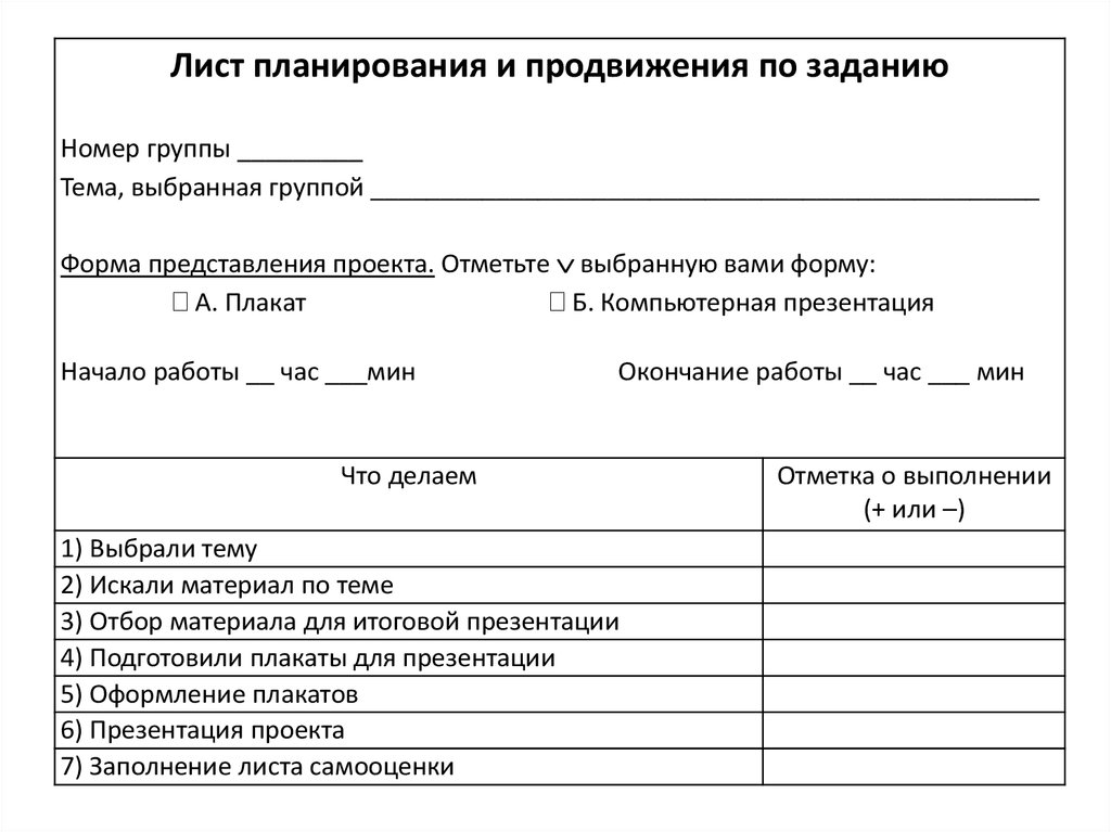 Лист планирования и продвижения по заданиюНомер группы _________