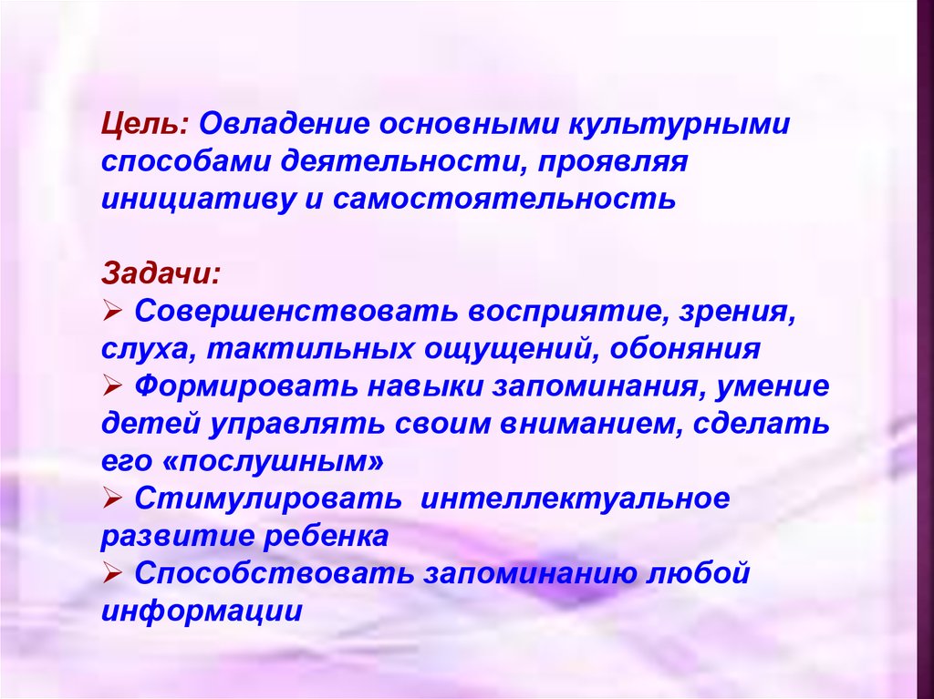 Цель: Овладение основными культурнымиспособами деятельности, проявляя