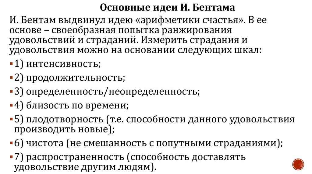 Основные идеи И. БентамаИ. Бентам выдвинул идею «арифметики счастья». В ее